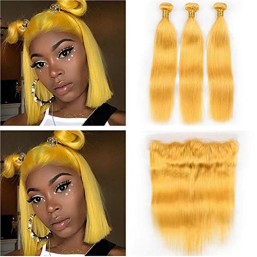 Yellow Color Straight Hair Bundles with Frontal Pure Yellow Peruvian Human Hair Weaves 3 Bundles with 13x4 Lace Frontal Colored Yellow Hair Wefts with Frontal Closure (24 26 28