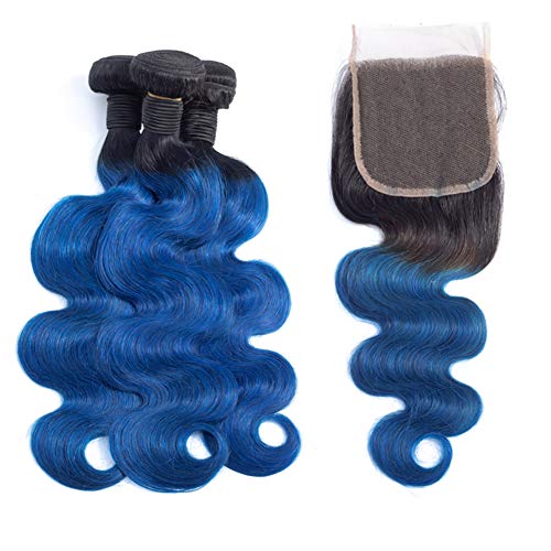 1b/blue Body Wave Bundles with Closure 2 Tone Ombre Hair 3 Bundles With Closure Brazilian Remy Human Hair Body Weft Ombre Human Hair Bundles 1b/Blue Black to Blue (12 14 16+10, 1/Blue Body)