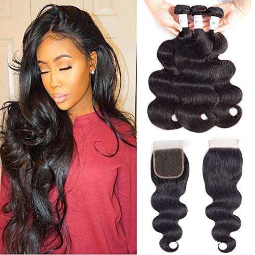 ITODAY Human Hair 3 Bundles with Closure 100% Brazilian Body Wave Remy Human Hair Weave with Closure Pre Plucked with Baby Hair Natural Color (26 28 28+20, Natural color)