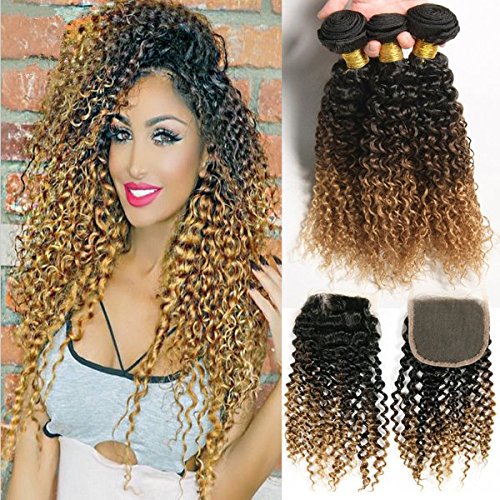 8A Ombre Hair Extensions Brazilian Virgin Human Hair Curly Weave Free Part Ombre Closure With 3 Pcs Hair Bundles -202224+20inch : Beauty